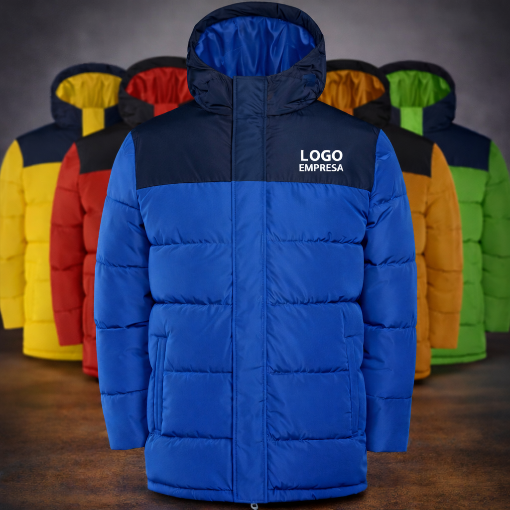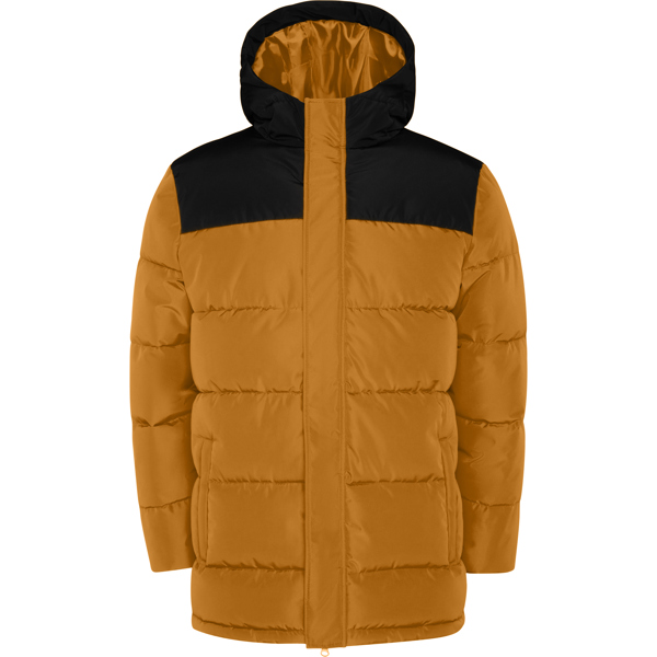 Parka acolchoada hidrorrepelente com capuz fixo e viseira. Fecho de correr frontal coberto por uma carcela. Protetor de queixo no mesmo tecido. Punhos elásticos. Bolsos laterais com fecho de correr e debruns no mesmo tecido. Bolso interior no lado esquerdo do peito.